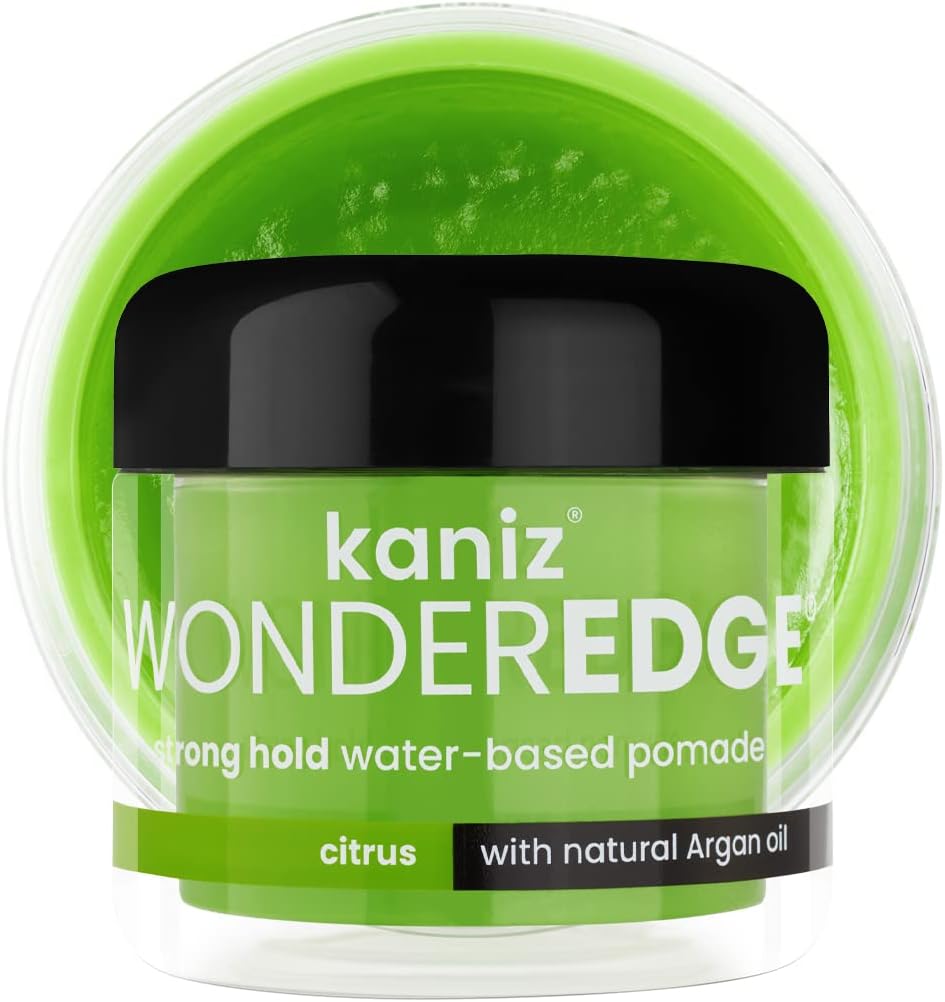 Kaniz Wonder Edge Citrus Scent Strong Hold Water-Based Pomade provides a firm, long-lasting hold for baby hairs and slicked-back edges while delivering nourishment and moisture. Infused with natural Argan Oil, this non-greasy, flake-free formula ensures sleek, textured hair with a radiant shine. The refreshing citrus scent offers an invigorating touch, adding a burst of energy to your daily styling routine.